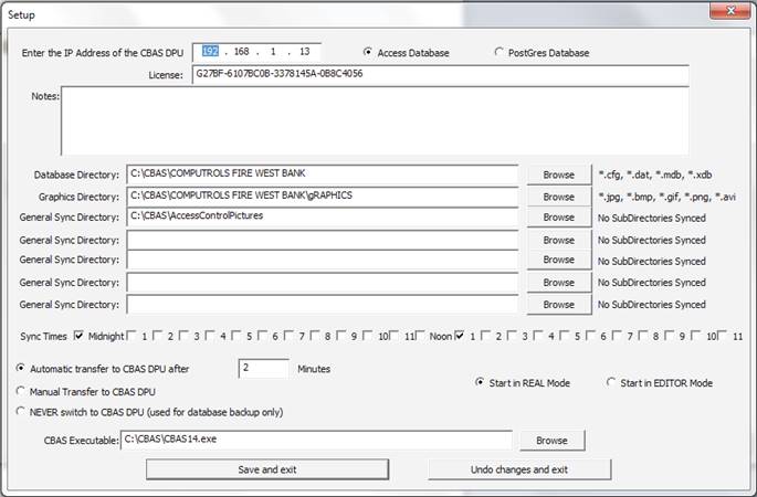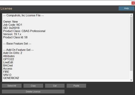 In order to enter Real Mode (next section), you must purchase a license to use the CBAS software. This is also required in order to use add-on features like 3rd party protocol interfaces and other features. You will be issued a Key-Lok (dongle), which is a hardware key that plugs into a USB slot. It works in conjunction with a license text file. Both are assigned an ID number and name of the site. The two have to match in order for CBAS Real Mode to work. The license text file is now stored in the database. The Site ID on both must match and the version on the license must match the version of CBAS that you are running, at least the first 2 numbers of the version. Like 17.1 or 19.1.
