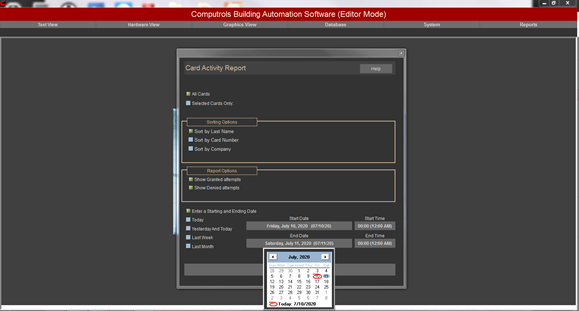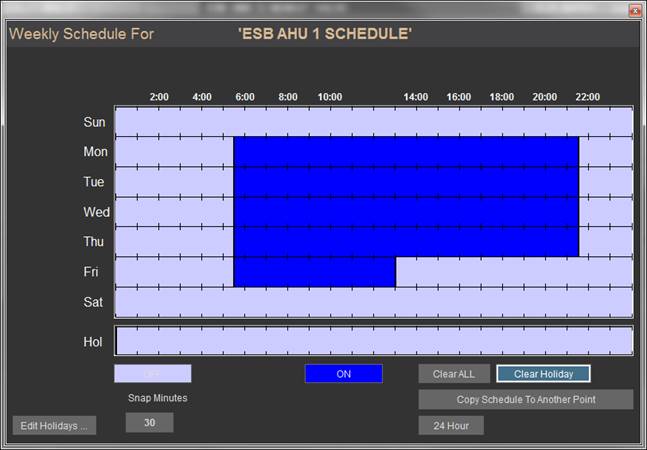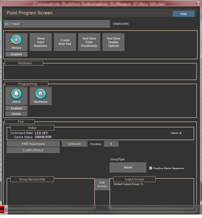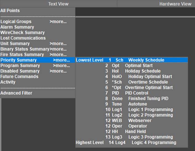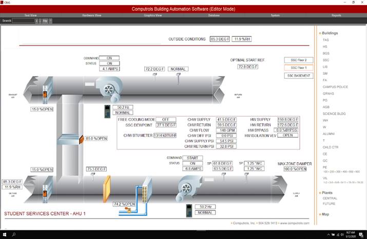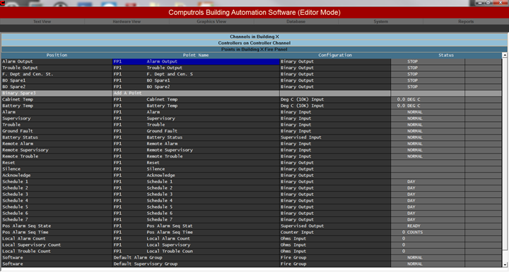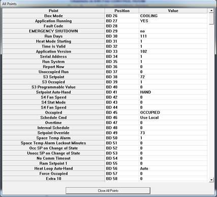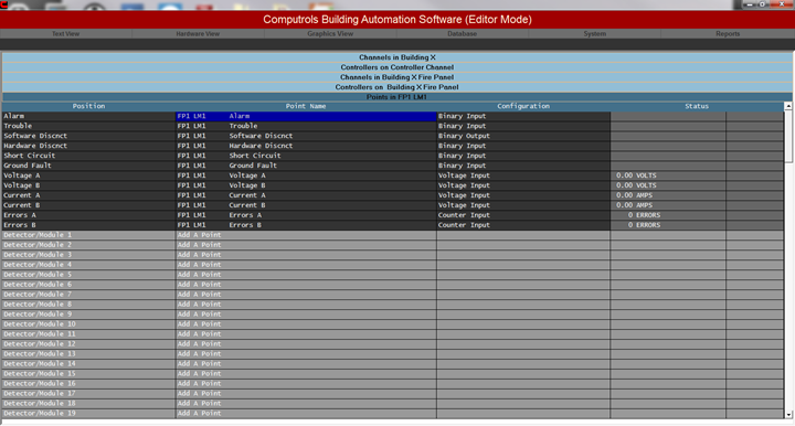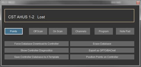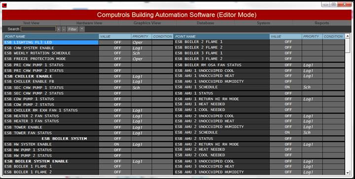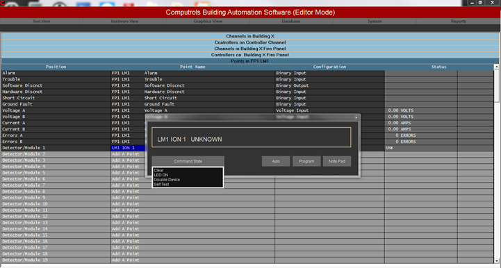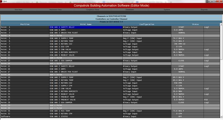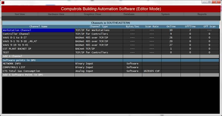Real Mode is the only mode where communication is enabled between the CBAS computer and the controllers and workstations in the database. Consequently, this is the only mode where On Scan and Off Scan work. Points can be commanded On, Off, and Auto. All programming of Channels, Controllers, and Points can be done in Real Mode, including Logic, Schedules, PIDs, Alarms, etc. Points can be repositioned in Text View. On the System Menu, some statistics and controller information can be obtained.