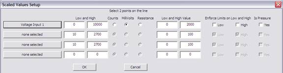 Then click the Scaler Setup button and set the values as seen below. I assumed that the high limit of the output from the sensor is 2000 ppm, so the Low Limit is 0 and the High Limit is 2000. The 10000 is the number of millivolts in 10 Volts. So, 0 to 10 Volts equals 0 to 2000 ppm. Click OK when done.