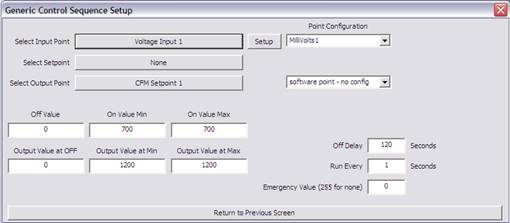 Here is an example how to setup a sequence where a CO2 sensor is used to set the CFM Setpoint to the Max CFM when CO2 level reaches a certain value.